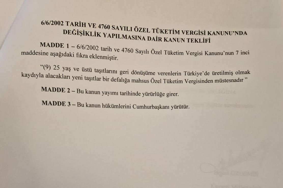 Ankara kulisleri hareketlendi. 25 yaş üstü araçların hurdaya ayrılması karşılığında, yerli üretim araçlarda Özel Tüketim Vergisi (ÖTV) muafiyeti getiren kanun teklifi Meclis gündemine geliyor.