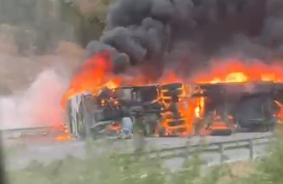 Pozantı – Adana otoyolunda seyir halindeki bir tır henüz bilinmeyen bir nedenle yan devrilerek alev aldı.