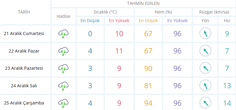 21-25 Aralık tarihleri arasında Pozantı için meteoroloji tahminleri