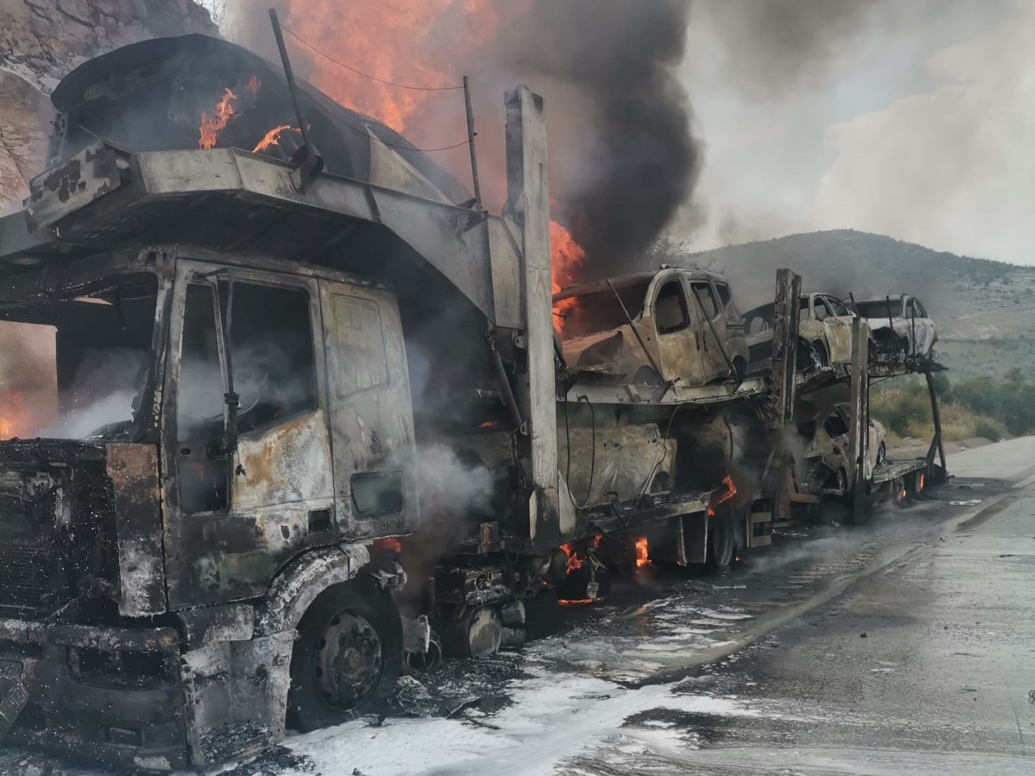 Durumu fark eden sürücü Ömer Güleç tırı güvenlik şeridinde durdurdu. Rüzgârında etkisiyle alevler bir anda aracın her tarafını sardı. Büyükşehir Belediyesi itfaiye ekiplerinin müdahalesi ile yangın söndürülürken, tır ile birlikte yük olarak taşınan 7 otomobil hurdaya döndü, bir otomobil ise son anda kurtarıldı. Şans eseri yaralananın olmadığı olayla ilgili soruşturma başlatıldı.